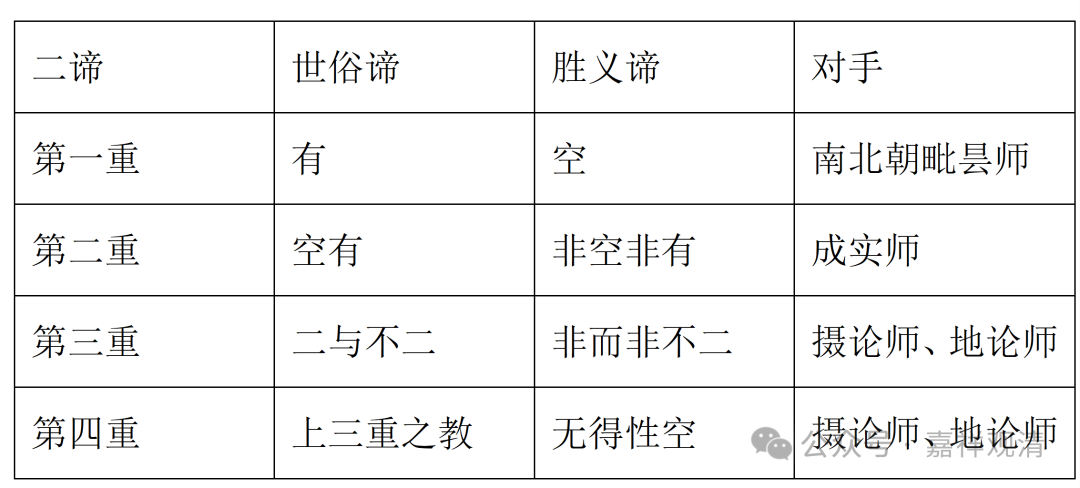 吉藏的 “四重二谛说”很明确是有假想敌的,每一重都有针对 的具体对手,是对对手 “二谛论”的矫正。