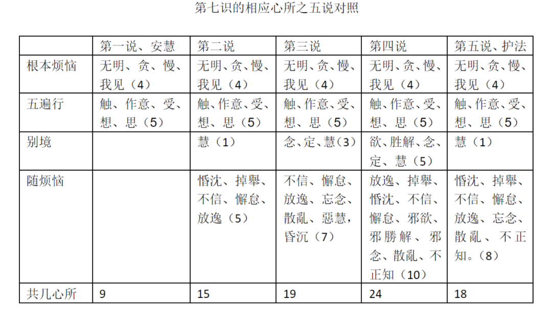 ( 3 、第三说,第七识相应心所有十九,除第一说之九心所外,加别境之念、定、慧,加《瑜伽》五十五之随烦恼七——“不信、懈怠、放逸、忘念、散亂、惡慧,昏沉”;)